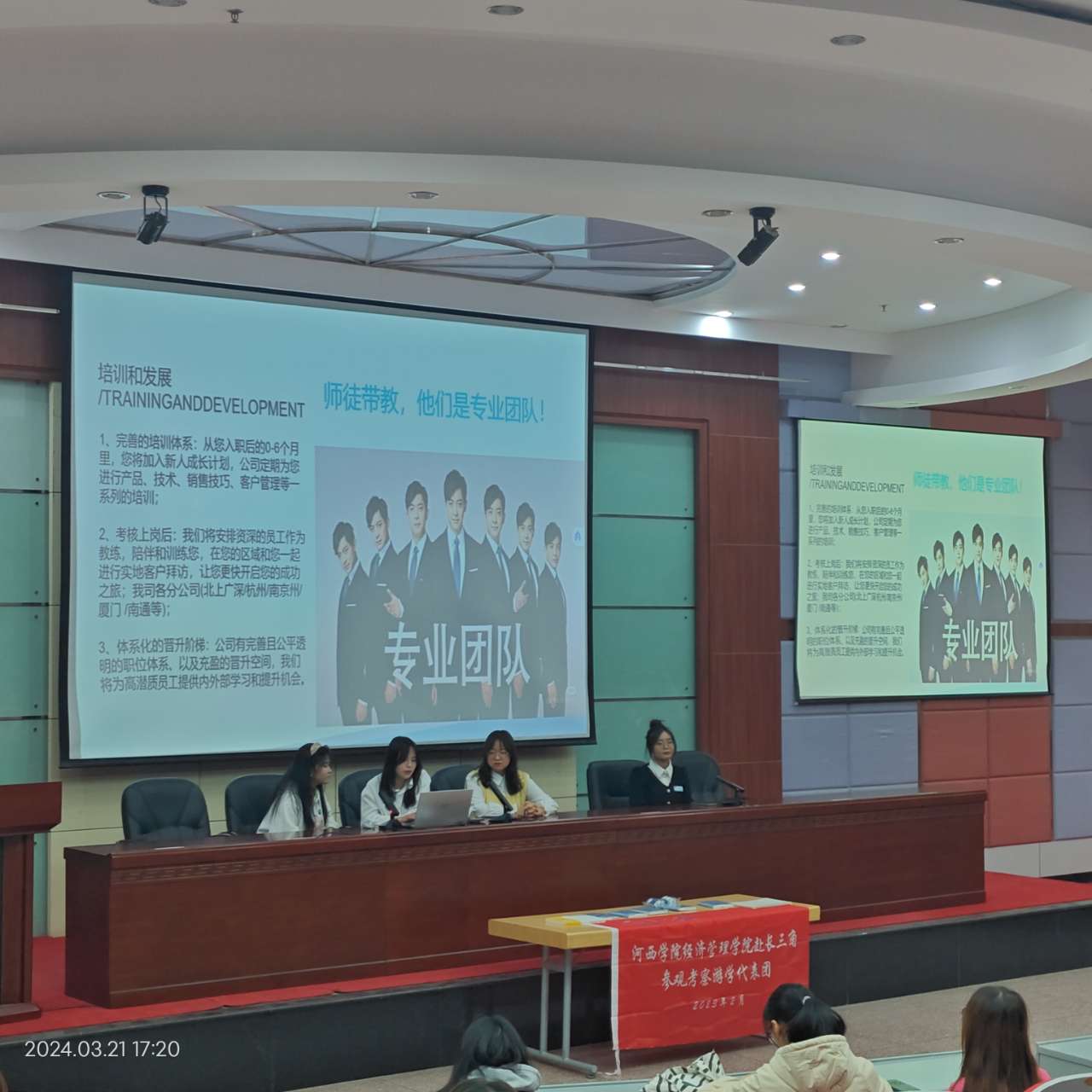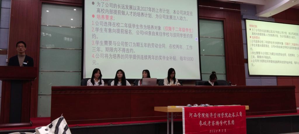宣讲会以游学团队代表通过现身说法讲故事的形式,谈了游学团队走访的江苏汇鼎眼视光集团、上海伟伟纺织有限公司、上海美再晨体育管理咨询有限公司、上海东盛餐饮管理有限公司四家企业的认知和感受,并对企业的情况简介、应聘要求、实习薪资、晋升渠道、企业文化、福利待遇等方面进行了讲解和视频宣传,对同学们提出的问题进行答疑解惑。